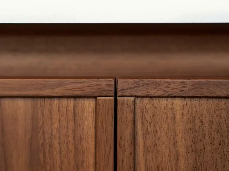 L’esthétique minimaliste est soulignée par les poignées entre cadres : les façades lisses et épurées favorisent une lecture continue de la ligne, renforcée par des jeux de lumière LED discrets, intégrés sous les éléments hauts et dans les niches.