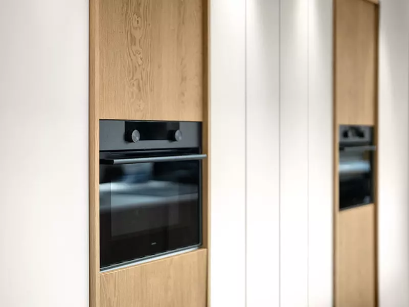 Cette cuisine se distingue par une implantation sobre et élégante, articulée autour d’un îlot central aux lignes généreuses. Le contraste entre les façades mates Bianco Mali, aux tons clairs et apaisants, et le décor New Forest Oak, un chêne clair, crée une atmosphère à la fois contemporaine et chaleureuse. L’ensemble offre une composition équilibrée, qui joue avec les matières et les volumes pour révéler un espace de vie fonctionnel et raffiné.